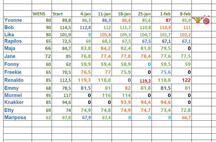 Goedemorgen, Onze resultaten van de afgelopen week dames en heer. En dit keer ben ik Topper van de Week, weer op de goede weg, en nu... doorzetten dus. Lieve mensen, we gaan er komende week een helemaal groene week van maken toch? Succes. Topper van de week Gewichtsafname vanaf 1 kilo Aanmoedigingshartje Gewichtsafname. Nog geen gegevens doorgegeven Even niet hier... Gelijk gebleven Gewichtstoename (boven streefgewicht) Gewichtstoename vanaf 1 kilo Kilokiller regeltjes * Je kunt alleen Topper van de week worden als je (daadwerkelijk) de voorgaande week je gewicht had doorgegeven. * Als je te laat bent en het weekoverzicht is al geplaatst kun je je gewicht uiteraard nog doorgeven, het wordt de volgende week verwerkt, je doet dan alleen niet meer mee voor de Topper van de week. * Meld het even als je tijdelijk niet mee kunt doen, dan blijf je in de lijst staan. * Als je 4 keer zónder bericht geen gewicht doorgeeft word je uit de lijst verwijderd en gaat een wachttijd van 4 weken in... * Graag je gewicht uiterlijk zaterdag doorgeven, dan kan ik op zondagmorgen gelijk aan de slag...