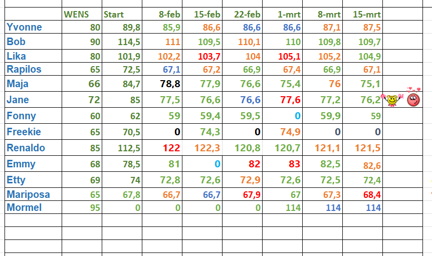 Goedemorgen, Een dag later dan normaal helaas. Technische problemen zorgden ervoor dat ik geen gebruik kon maken van de laptop. Maar hier dan toch de resultaten van de vorige week. @lady janeis met glans Topper van de Week, mooi Jane... Rest mij jullie een mooie lenteweek te wensen...maak er wat moois van lui. Topper van de week Gewichtsafname vanaf 1 kilo Aanmoedigingshartje Gewichtsafname. Nog geen gegevens doorgegeven Even niet hier... Gelijk gebleven Gewichtstoename (boven streefgewicht) Gewichtstoename vanaf 1 kilo Kilokiller regeltjes * Je kunt alleen Topper van de week worden als je (daadwerkelijk) de voorgaande week je gewicht had doorgegeven. * Als je te laat bent en het weekoverzicht is al geplaatst kun je je gewicht uiteraard nog doorgeven, het wordt de volgende week verwerkt, je doet dan alleen niet meer mee voor de Topper van de week. * Meld het even als je tijdelijk niet mee kunt doen, dan blijf je in de lijst staan. * Als je 4 keer zónder bericht geen gewicht doorgeeft word je uit de lijst verwijderd en gaat een wachttijd van 4 weken in... * Graag je gewicht uiterlijk zaterdag doorgeven, dan kan ik op zondagmorgen gelijk aan de slag...