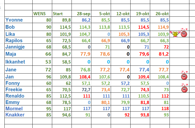 Goedemiddag, Wat later dan normaal, maar ze staan er weer, de cijfers die onze kilo's vertegenwoordigen: Rood, oranje, groen en blauw... Topper van deze week is @Lika, met @Freekie en @Jan1000 die haar op de hielen zitten, mooi. En ja @renaldo61, het is inderdaad voor veel van ons een moeizaam gevecht, maar beter schommelen dan constant langzaam maar zeker nóg meer aankomen.... Lieve mensen, we hebben weer een week de tijd iets groens te produceren... succes! Topper van de week Gewichtsafname vanaf 1 kilo Aanmoedigingshartje Gewichtsafname. Nog geen gegevens doorgegeven Even niet hier... Gelijk gebleven Gewichtstoename (boven streefgewicht) Gewichtstoename vanaf 1 kilo Kilokiller regeltjes * Je kunt alleen Topper van de week worden als je (daadwerkelijk) de voorgaande week je gewicht had doorgegeven. * Als je te laat bent en het weekoverzicht is al geplaatst kun je je gewicht uiteraard nog doorgeven, het wordt de volgende week verwerkt, je doet dan alleen niet meer mee voor de Topper van de week. * Meld het even als je tijdelijk niet mee kunt doen, dan blijf je in de lijst staan. * Als je 4 keer zónder bericht geen gewicht doorgeeft word je uit de lijst verwijderd en gaat een wachttijd van 4 weken in... * Graag je gewicht uiterlijk zaterdag doorgeven, dan kan ik op zondagmorgen gelijk aan de slag...