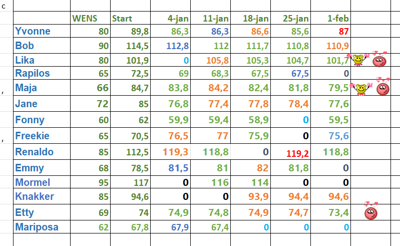 Zo, de cijfers van de afgelopen week... Veel 'groen', da's mooi. En twee Toppers van de Week: Maja ruim twee kilo kwijt en Lika nog wat meer, maar dat heeft ook te maken met ziekte... desalniettemin: mooie start van februari. Lieve mensen, we hebben weer een hele week om er iets moois van te maken, succes. Topper van de week Gewichtsafname vanaf 1 kilo Aanmoedigingshartje Gewichtsafname. Nog geen gegevens doorgegeven Even niet hier... Gelijk gebleven Gewichtstoename (boven streefgewicht) Gewichtstoename vanaf 1 kilo Kilokiller regeltjes * Je kunt alleen Topper van de week worden als je (daadwerkelijk) de voorgaande week je gewicht had doorgegeven. * Als je te laat bent en het weekoverzicht is al geplaatst kun je je gewicht uiteraard nog doorgeven, het wordt de volgende week verwerkt, je doet dan alleen niet meer mee voor de Topper van de week. * Meld het even als je tijdelijk niet mee kunt doen, dan blijf je in de lijst staan. * Als je 4 keer zónder bericht geen gewicht doorgeeft word je uit de lijst verwijderd en gaat een wachttijd van 4 weken in... * Graag je gewicht uiterlijk zaterdag doorgeven, dan kan ik op zondagmorgen gelijk aan de slag...