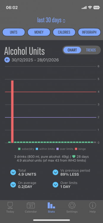 Het leuke van de alcohol-app vond ik altijd wanneer er een flinke piek van de afgelopen maand van het grafiekje viel, want dan ging het gemiddelde omlaag. Lees tussen de regels: dan kon ik er weer een paar nemen. Dat gaat nog 1 keer gebeuren overmorgen, de oudejaarspiek. De app doet dat pas om 7 uur, dat is het eind van de nacht zogenaamd. Ik zat dan altijd tot 7 uur te wachten en daarna pas ging ik douchen en met de hond lopen. Ik was dan even trots ("achievement afvinken") feitelijk alleen omdat ik 31 dagen daarvoor gedronken had. Suf hè? 🤣