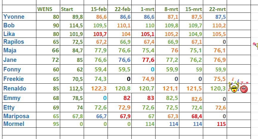 |Goedemorgen, De cijfers van de afgelopen week. Slechts 2 groene vakjes... Mooi @renaldo61, Topper van de Week, vasthouden nu!!!! Lieve mensen, we hebben weer een hele week om er iets moois, iets groens van te maken. Succes! Topper van de week Gewichtsafname vanaf 1 kilo Aanmoedigingshartje Gewichtsafname. Nog geen gegevens doorgegeven Even niet hier... Gelijk gebleven Gewichtstoename (boven streefgewicht) Gewichtstoename vanaf 1 kilo Kilokiller regeltjes * Je kunt alleen Topper van de week worden als je (daadwerkelijk) de voorgaande week je gewicht had doorgegeven. * Als je te laat bent en het weekoverzicht is al geplaatst kun je je gewicht uiteraard nog doorgeven, het wordt de volgende week verwerkt, je doet dan alleen niet meer mee voor de Topper van de week. * Meld het even als je tijdelijk niet mee kunt doen, dan blijf je in de lijst staan. * Als je 4 keer zónder bericht geen gewicht doorgeeft word je uit de lijst verwijderd en gaat een wachttijd van 4 weken in... * Graag je gewicht uiterlijk zaterdag doorgeven, dan kan ik op zondagmorgen gelijk aan de slag...
