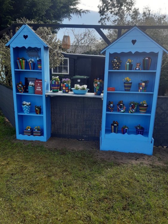 Goeiemorgen allemaal, De laatste weken heel druk met mijn kasten geweest. Ik wilde ze voor de Pasen af hebben. Ze staan nu naast mijn voortuintje opgesteld. Er staat een deel van mijn geschilderde potjes in met een klein plantje. Het is een leuke vrolijke boel vind ik. Ik hoop dat ik ze verkoop want dan kan ik doorschilderen. Dus ik ben lekker bezig en nu alles staat kan ik ff bijkomen. 😋